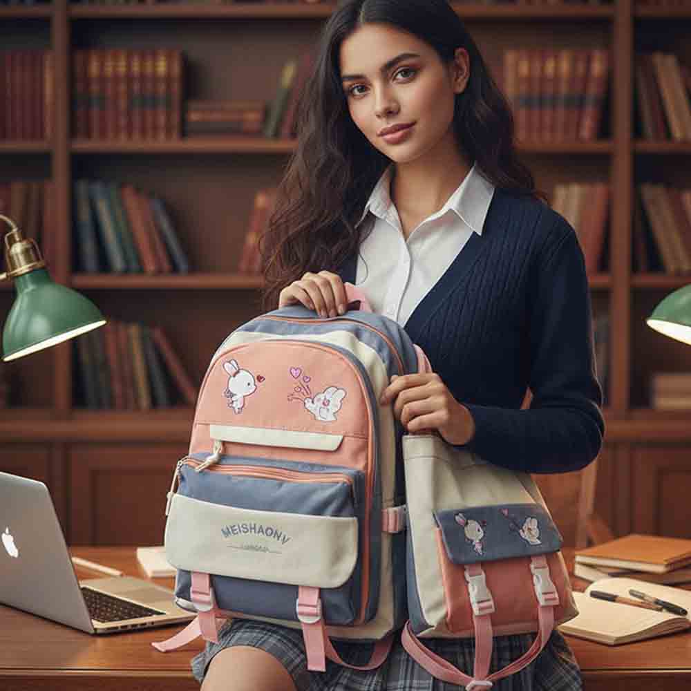 ¡Dale un toque tierno a tus días de estudio! Este set de 3 piezas es la combinación perfecta entre estética y funcionalidad. Con un diseño encantador de conejitos y una paleta de colores lila, rosa y crema, es ideal para destacar en el colegio o la universidad. Está fabricado en tela poliéster resistente, asegurando que te acompañe durante todo el año escolar.