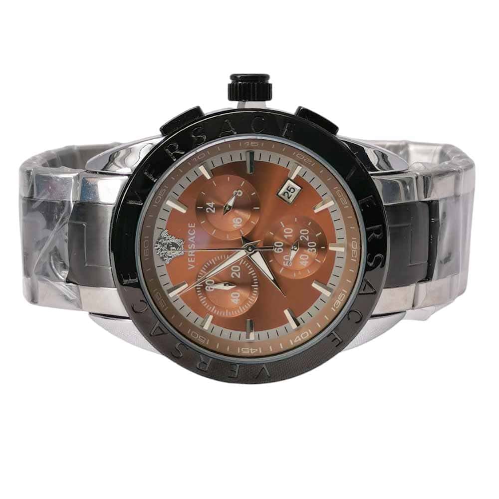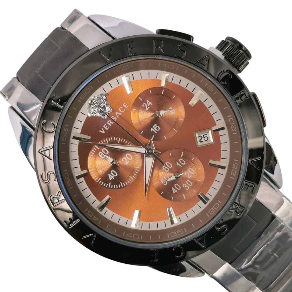El reloj Chrono, un estilo atemporal reinventado a partir de la línea Hellenyium original, presenta un preciso movimiento Swiss Chrono. El modelo está adornado con el Versace Logo y la Medusa en las 12 h y se completa con una correa de acero inoxidable. Todo el acero inoxidable es reciclado.